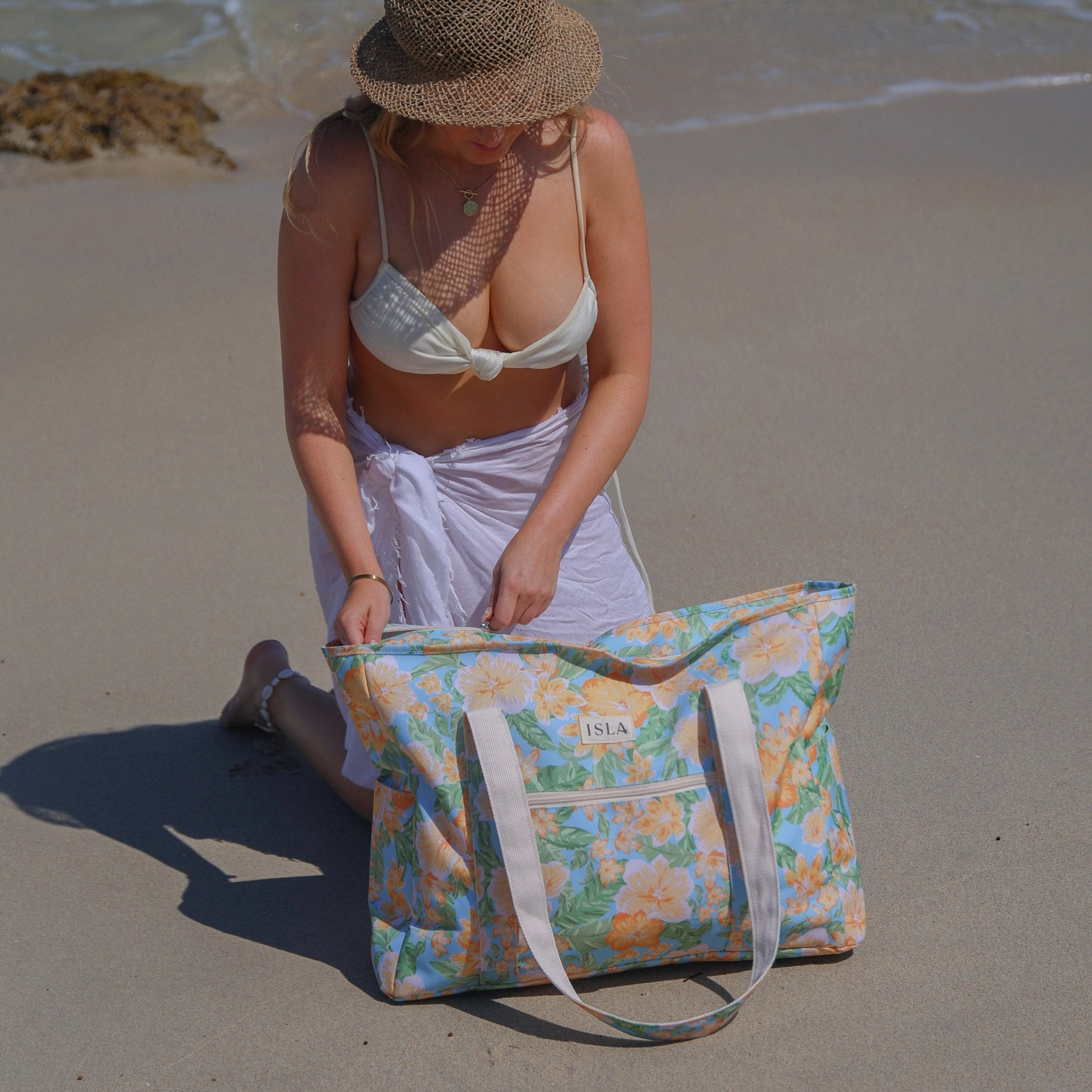 Our extra large beach bags are perfect for all your summer needs, from carrying your essentials to the beach, or the pool - and everything in between. It has a large external pocket to fit a water bottle and book, as well as an internal pocket with a secure zip top for your keys and phone. The canvas material is water-resistant and can withstand sand, salt water, and chlorine.