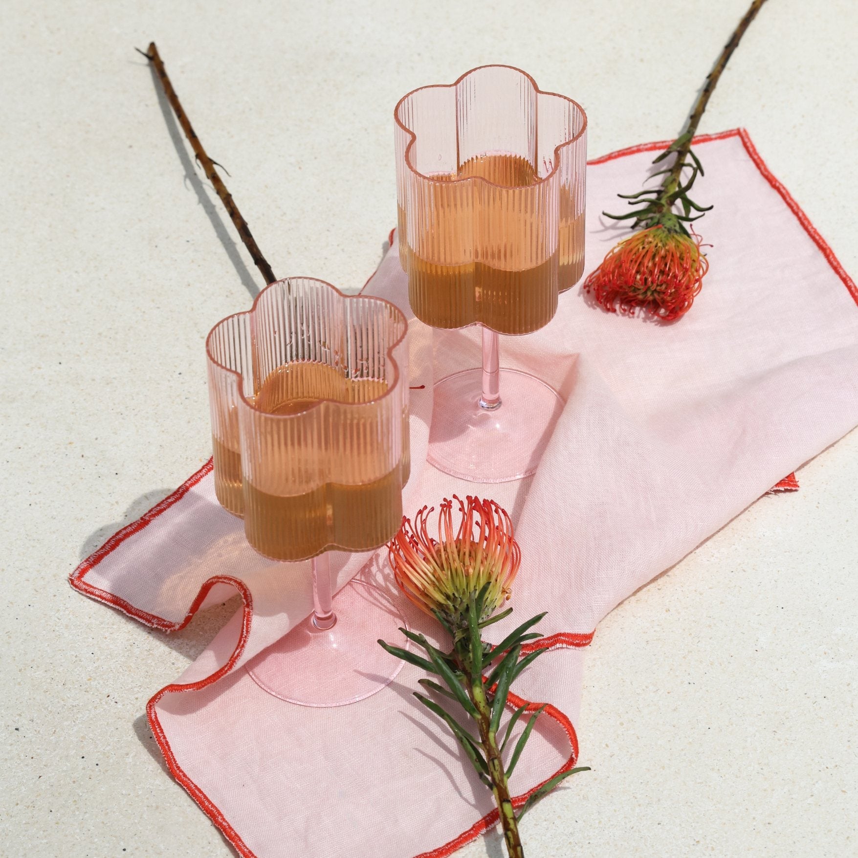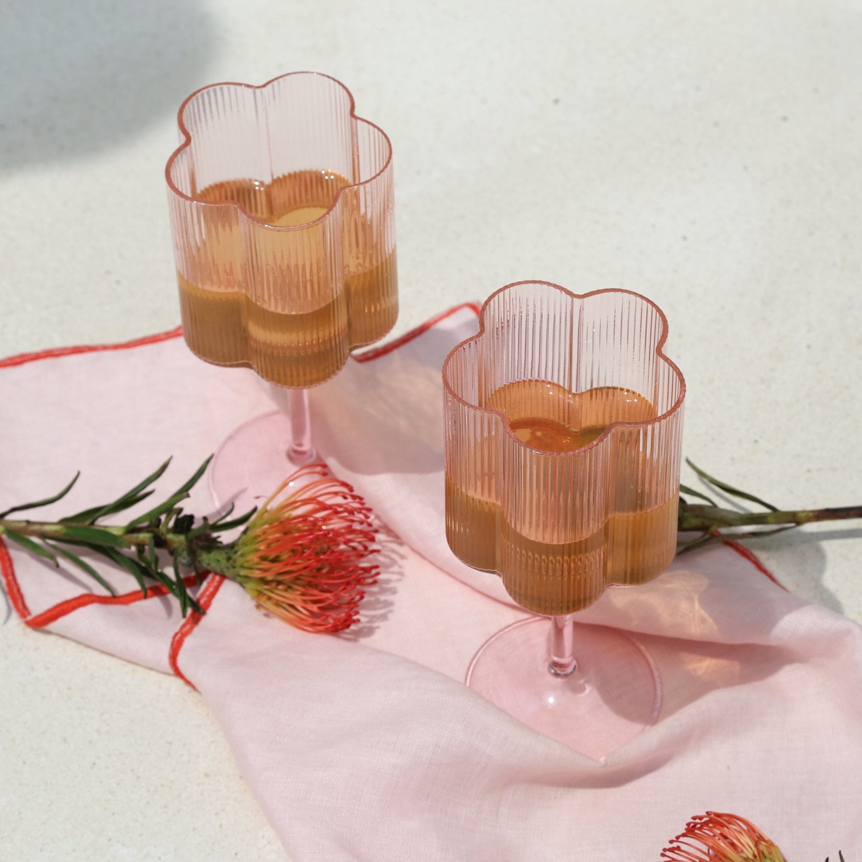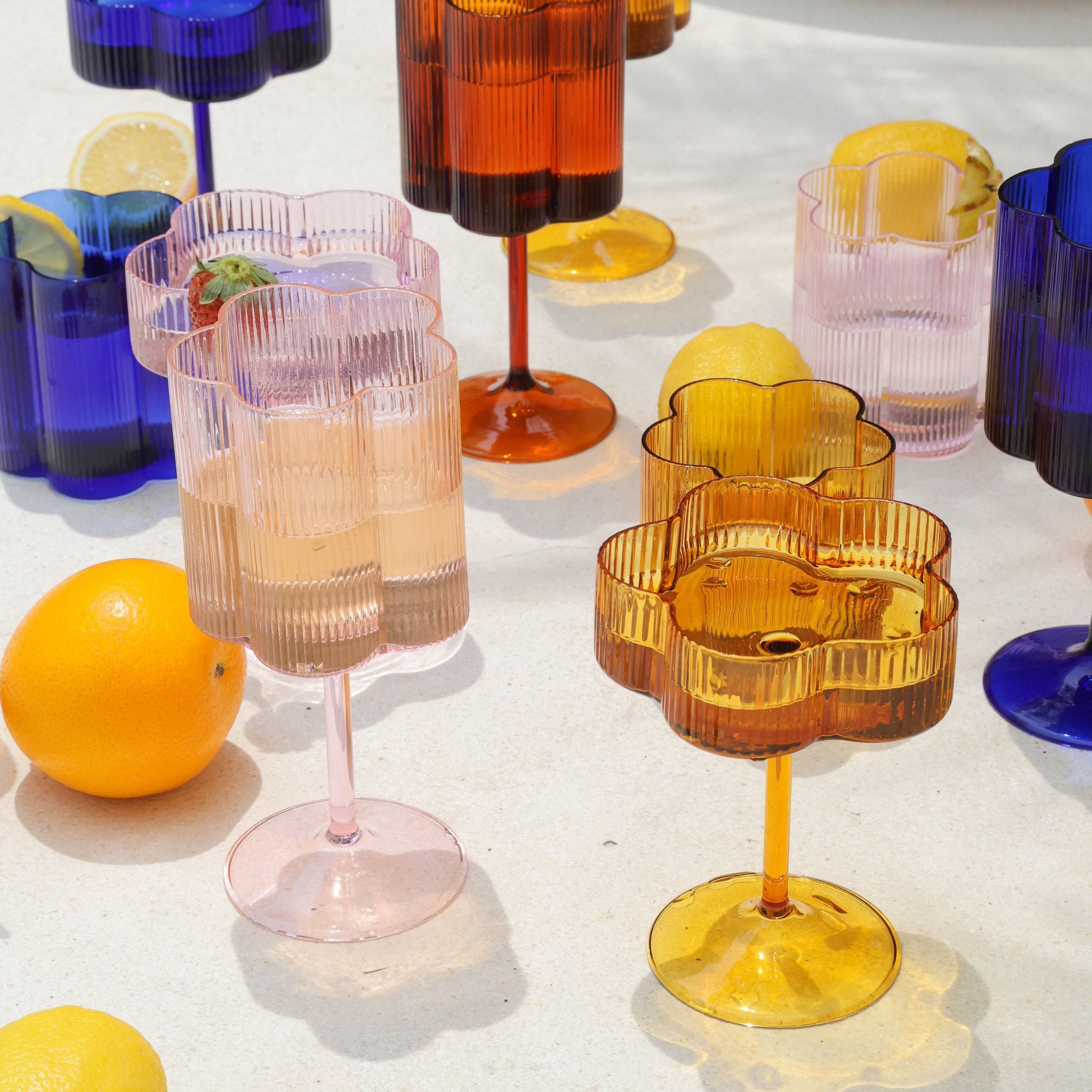 Uniquely crafted, flower-shaped glassware for picnics, parties and whimsical elegance at home.