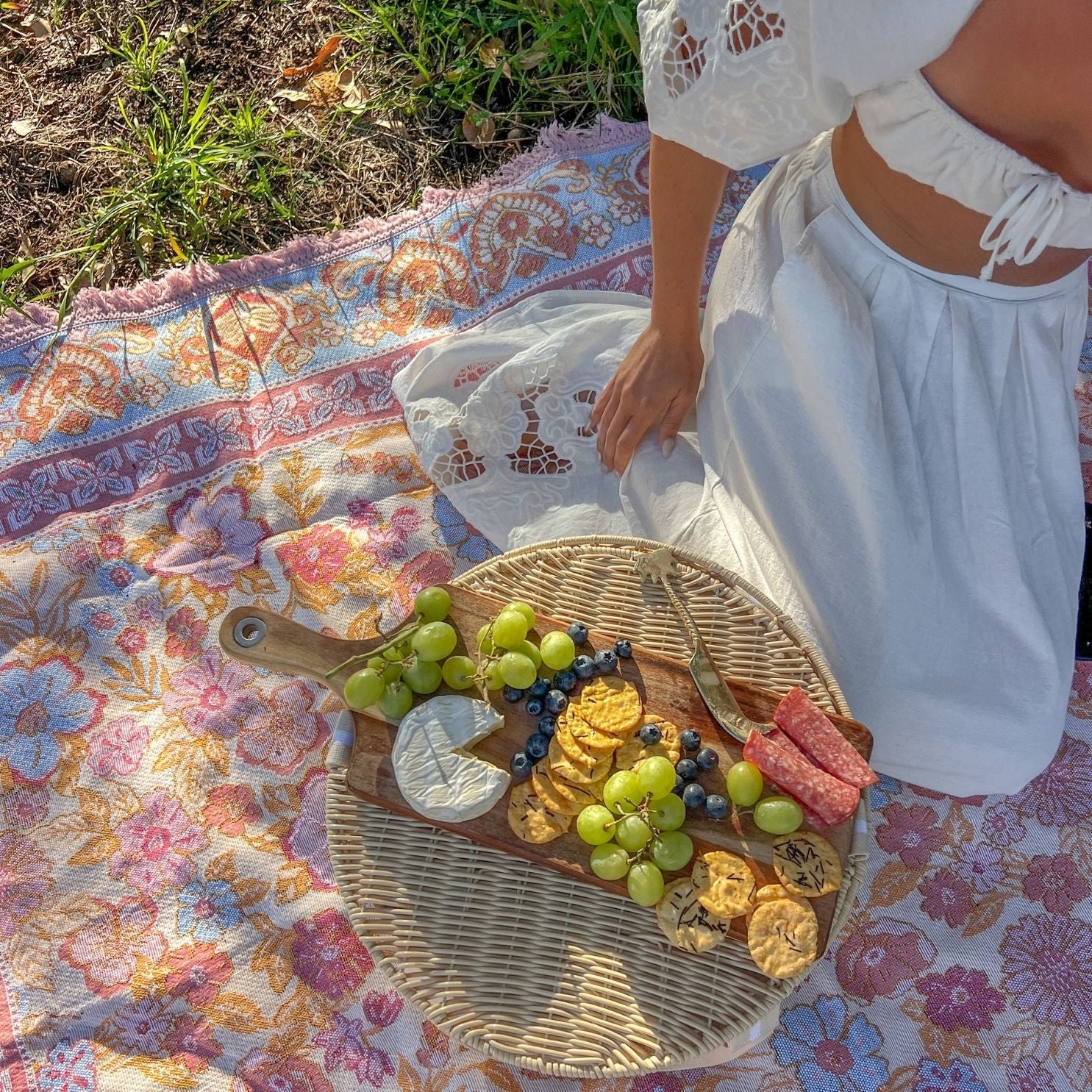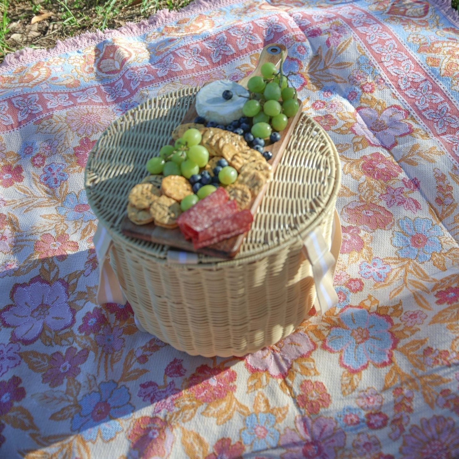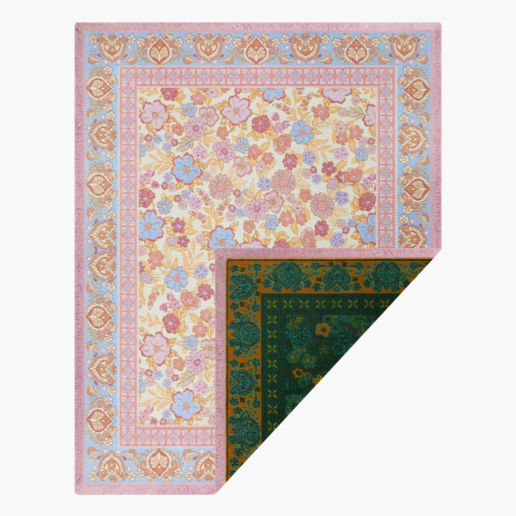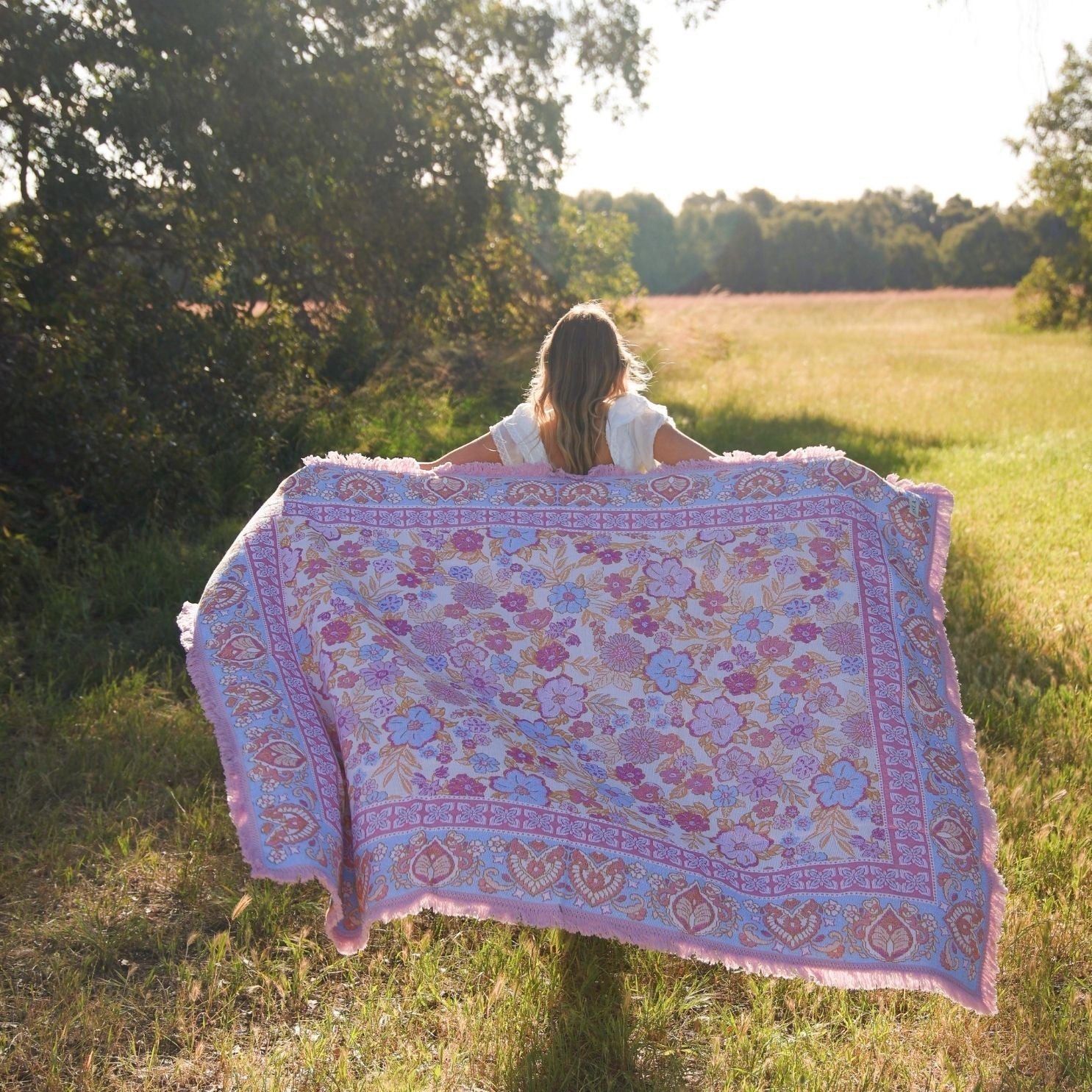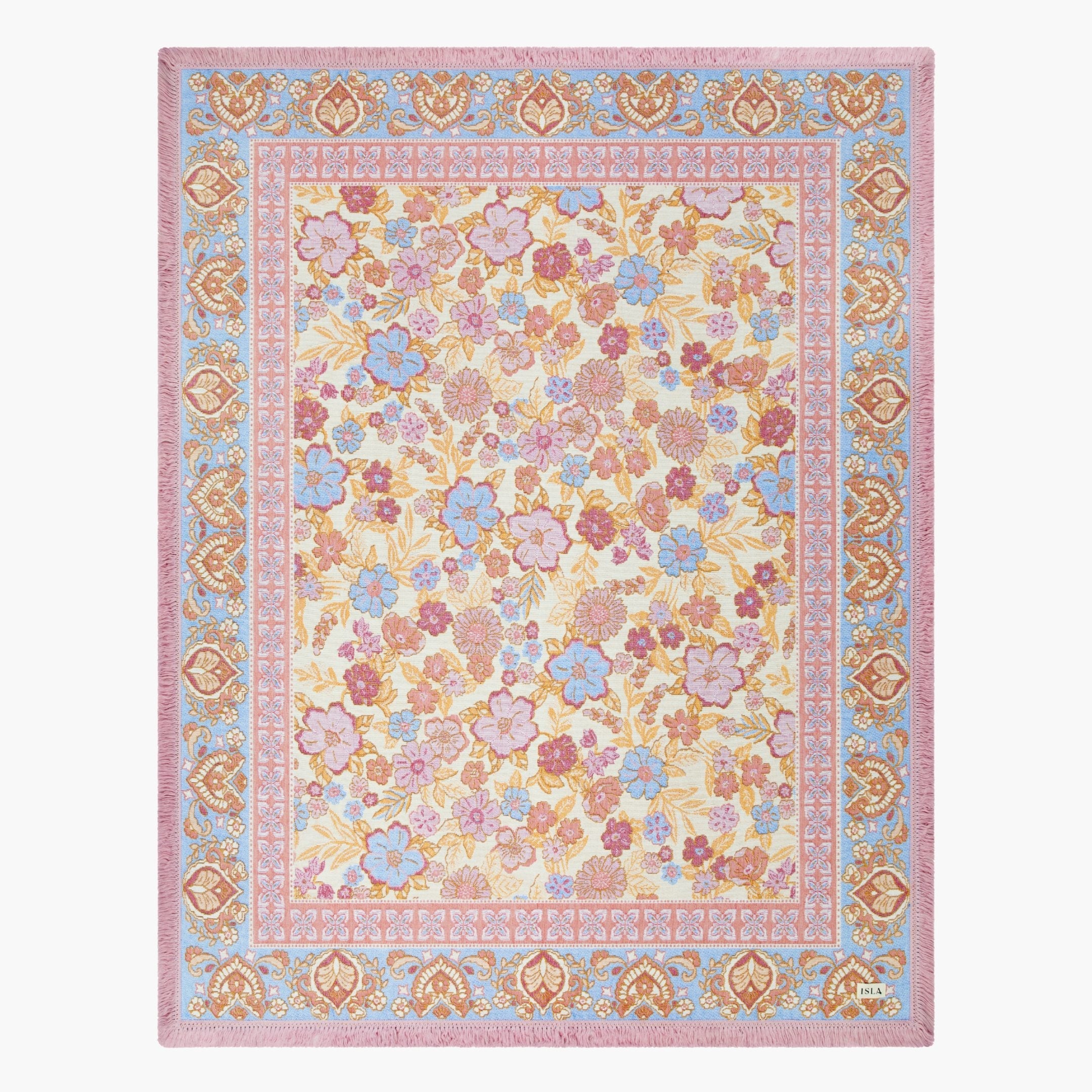 Daisy captures the softness of a sun-lit garden, woven in a feminine palette of blush, blue and orange tones. Its boho floral print brings a nostalgic, free-spirited beauty to picnics and slow afternoons outdoors. A piece made to elevate simple moments into memories.