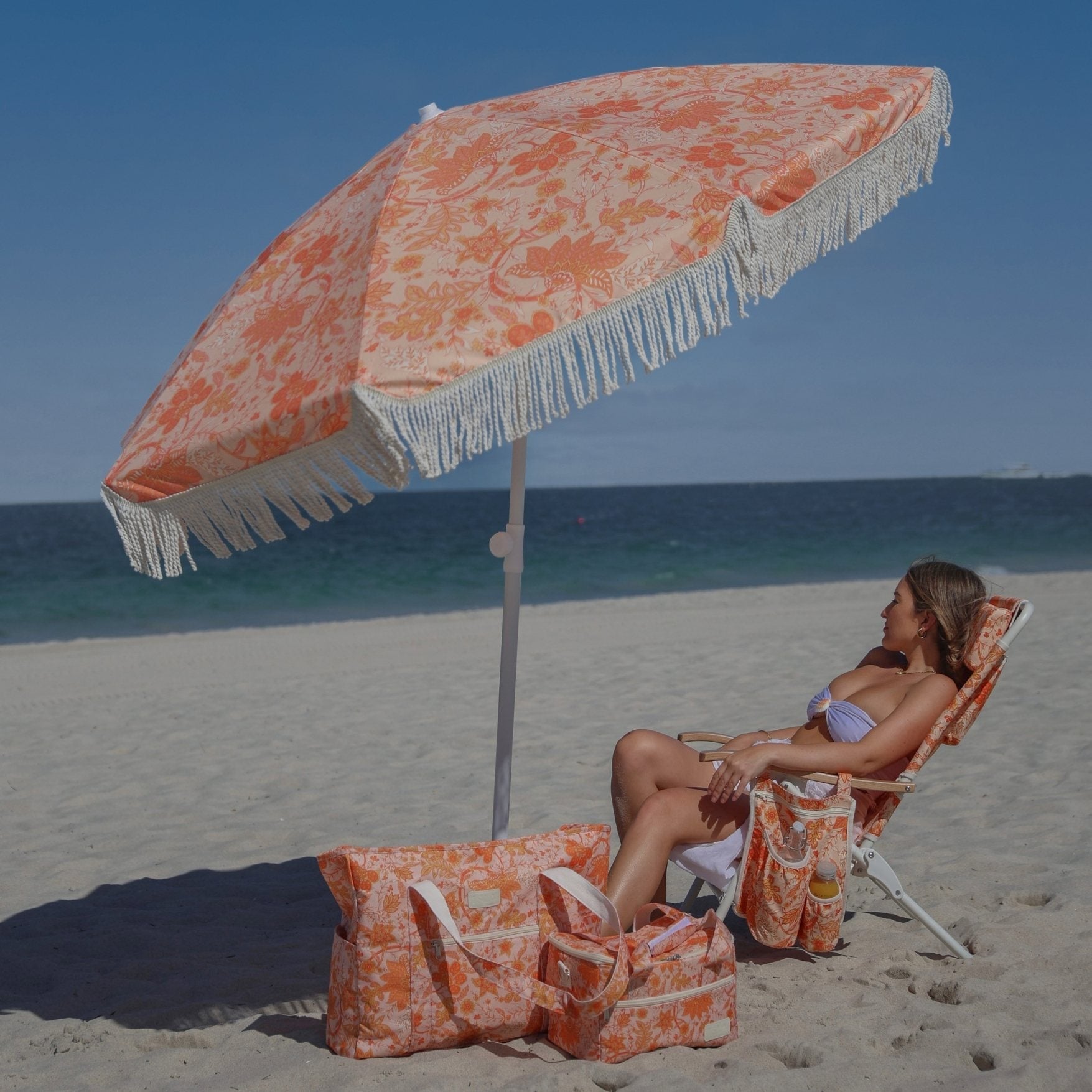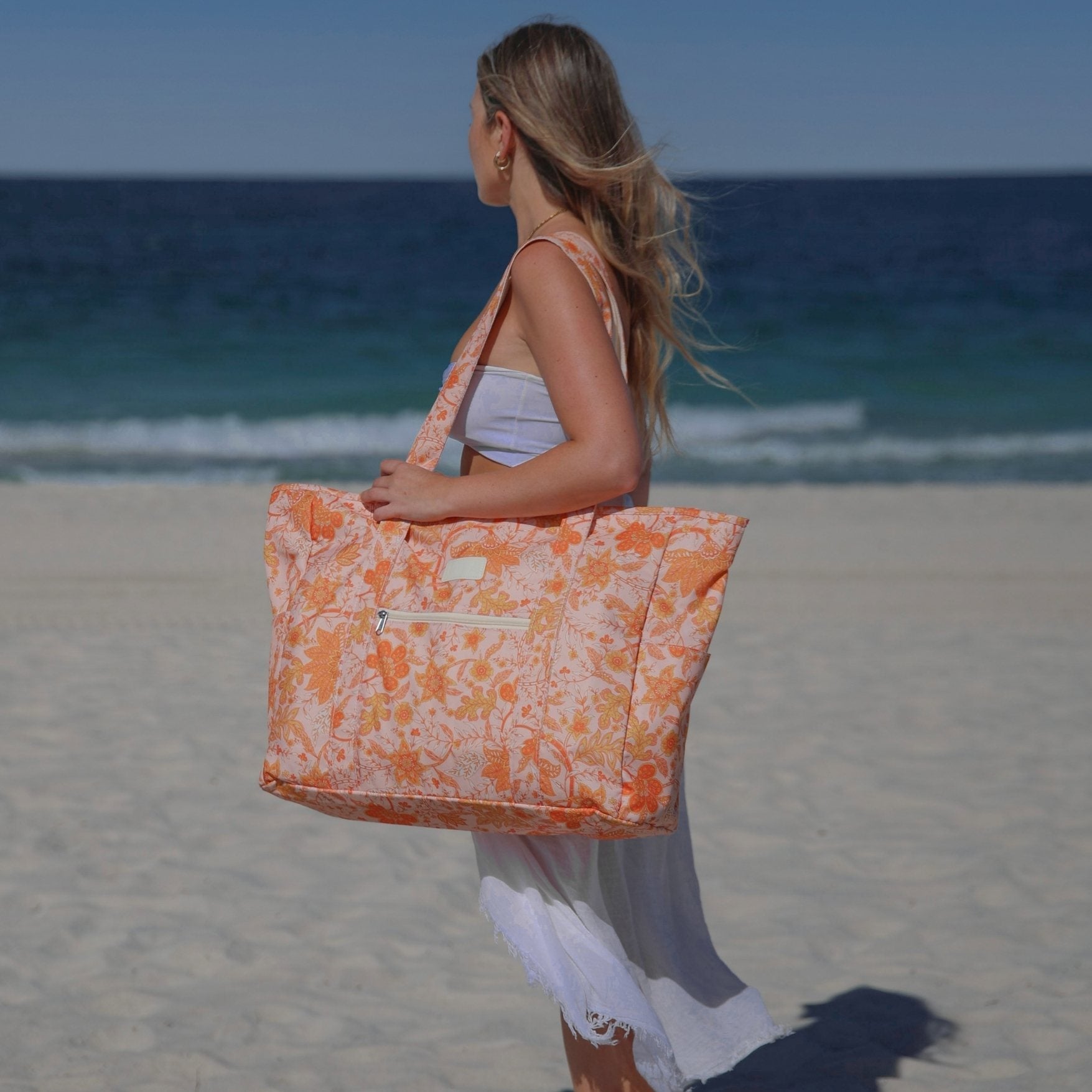 The Del Sol beach bag features sunlit oranges and golden yellows against a soft apricot backdrop. Generously sized to hold towels, outfits and picnic pieces, with durable handles for easy carrying. A joyful tote made for sunny, carefree days.
