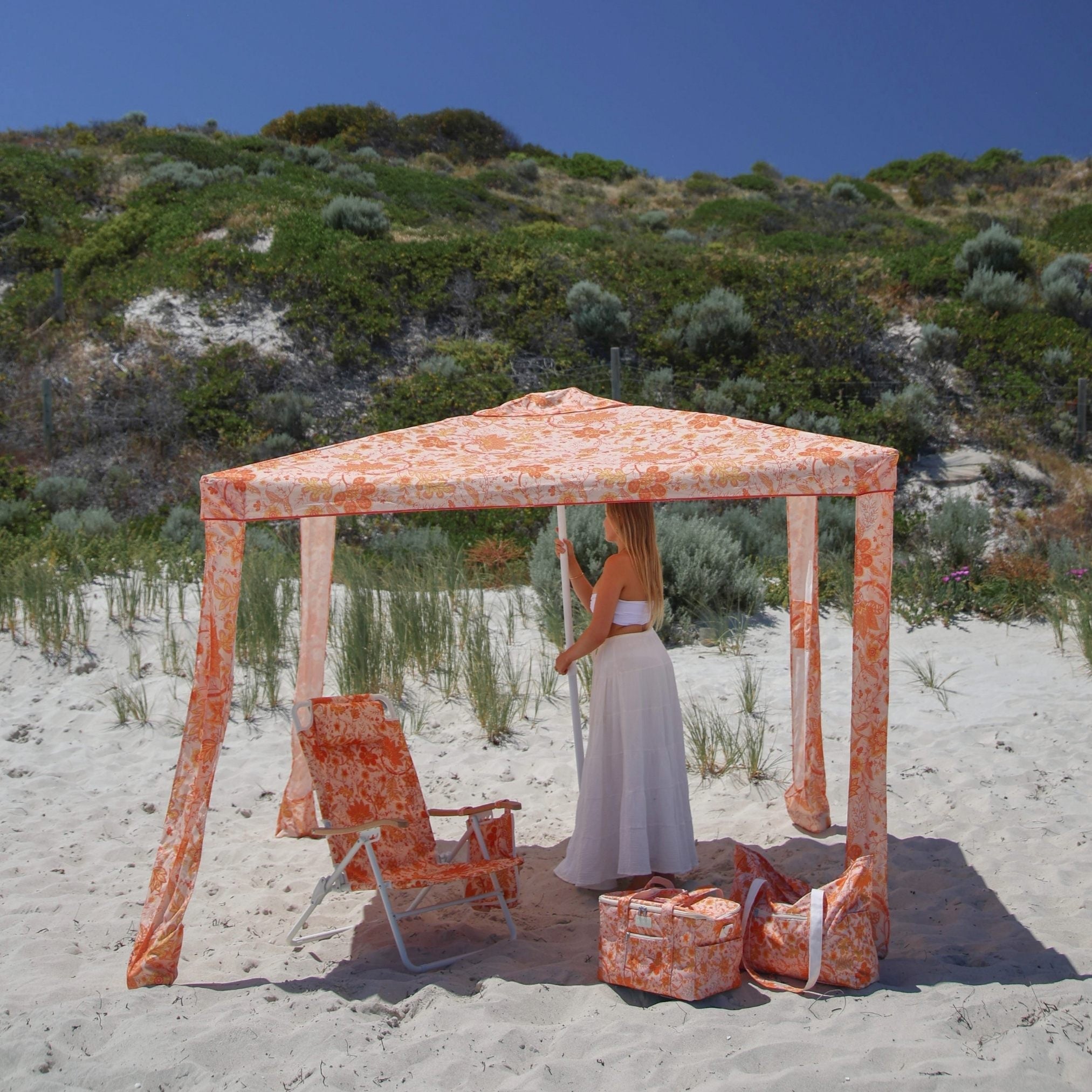 - Seek sun protection with a matching beach cabana or beach umbrella