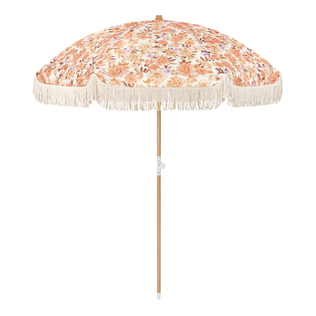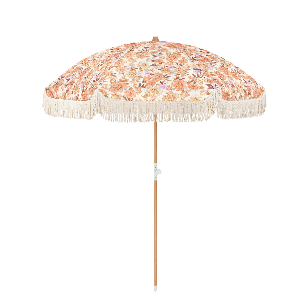 The Jardin premium umbrella is the ultimate beach accessory designed for warm days outdoors. Crafted with 100% recycled fabric, the canopy adorned in bohemian florals is the perfect size for seeking shade on a summer's day at the beach.