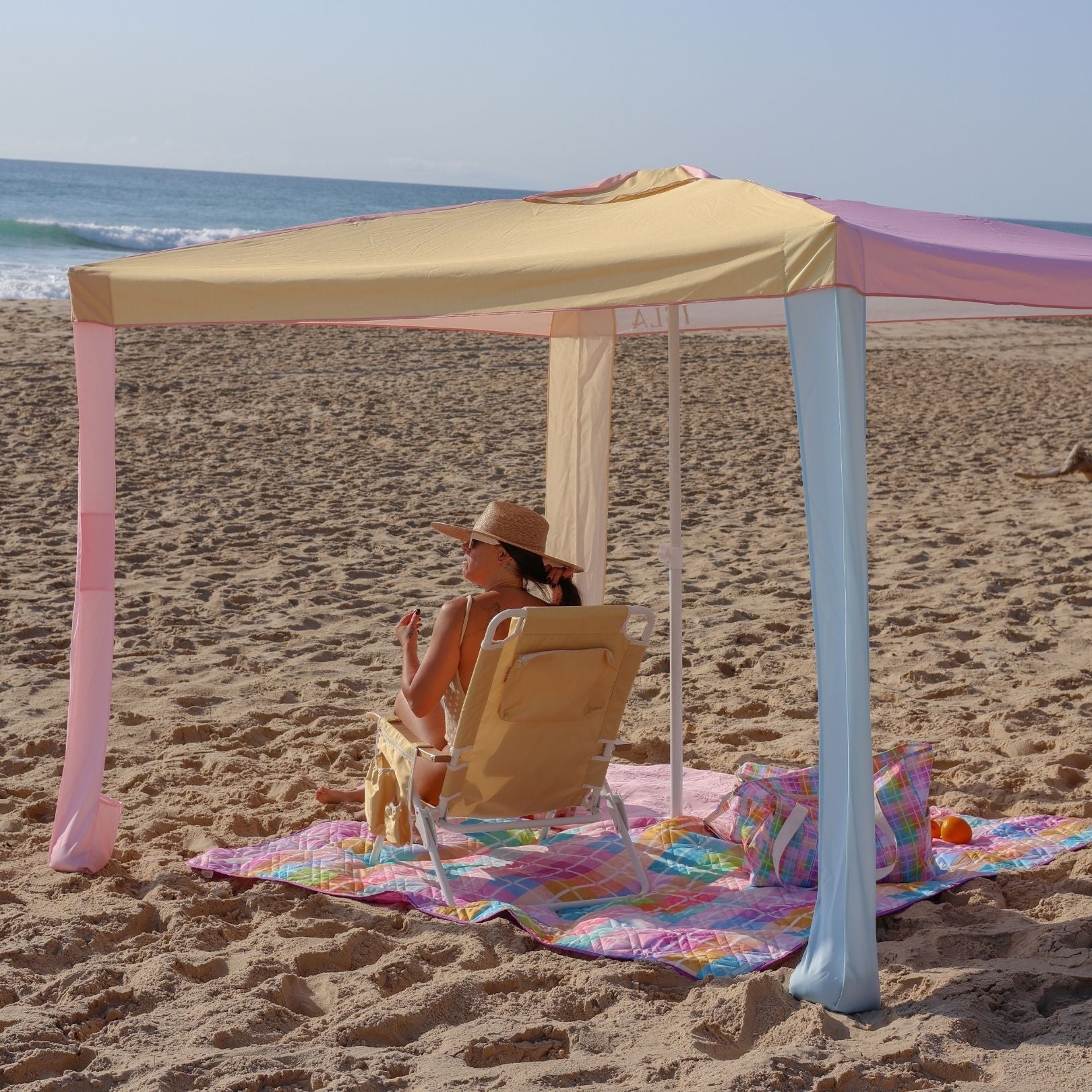 The Sorbet beach cabana has pastel colour blocks of peach, pink, blue and yellow for a nostalgic summer look. Crafted with UPF50+ premium canopy fabric and a spacious design, it provides reliable shade for families and friends. Complete with a matching carry bag, Sorbet combines playful colour, comfort and practicality for carefree days outdoors.