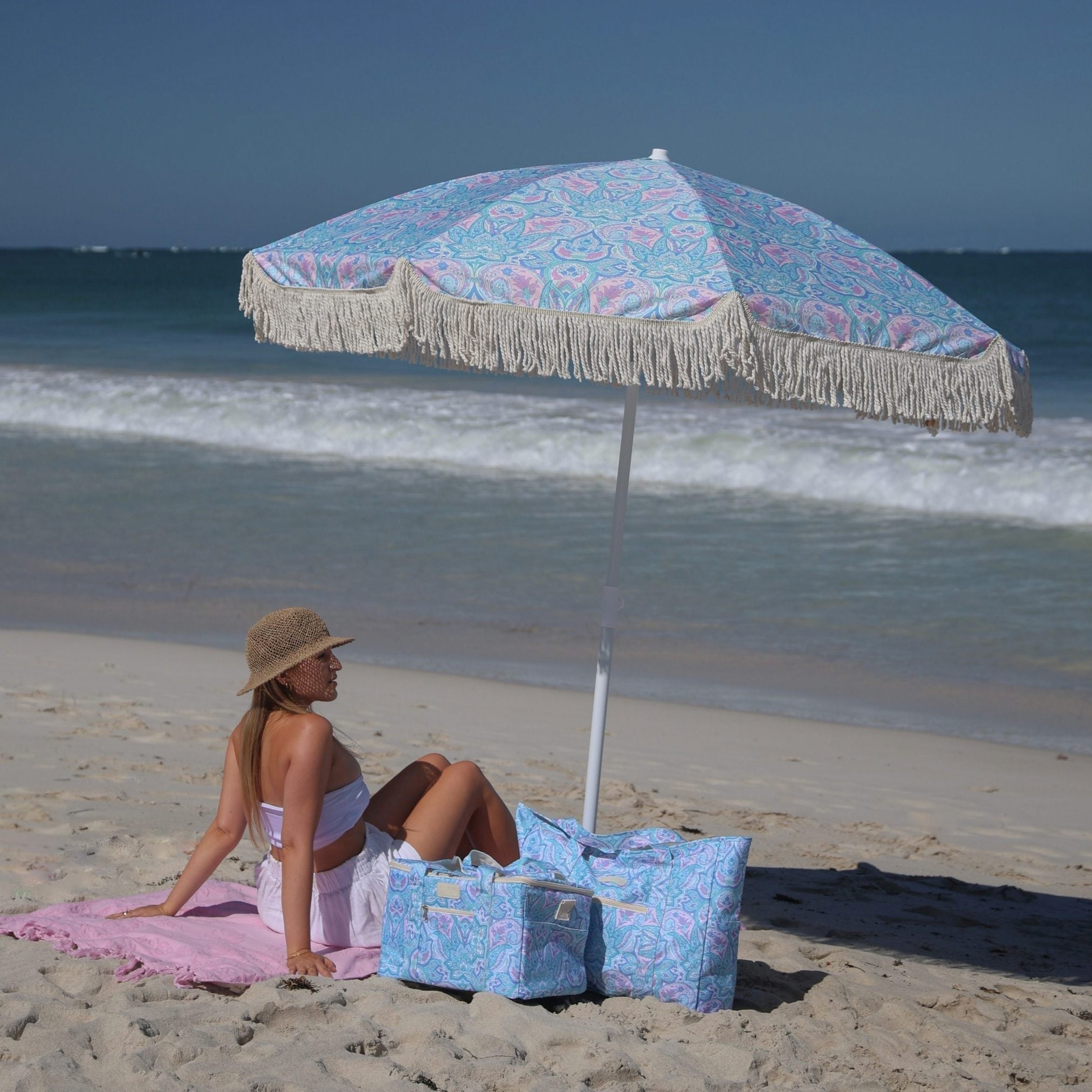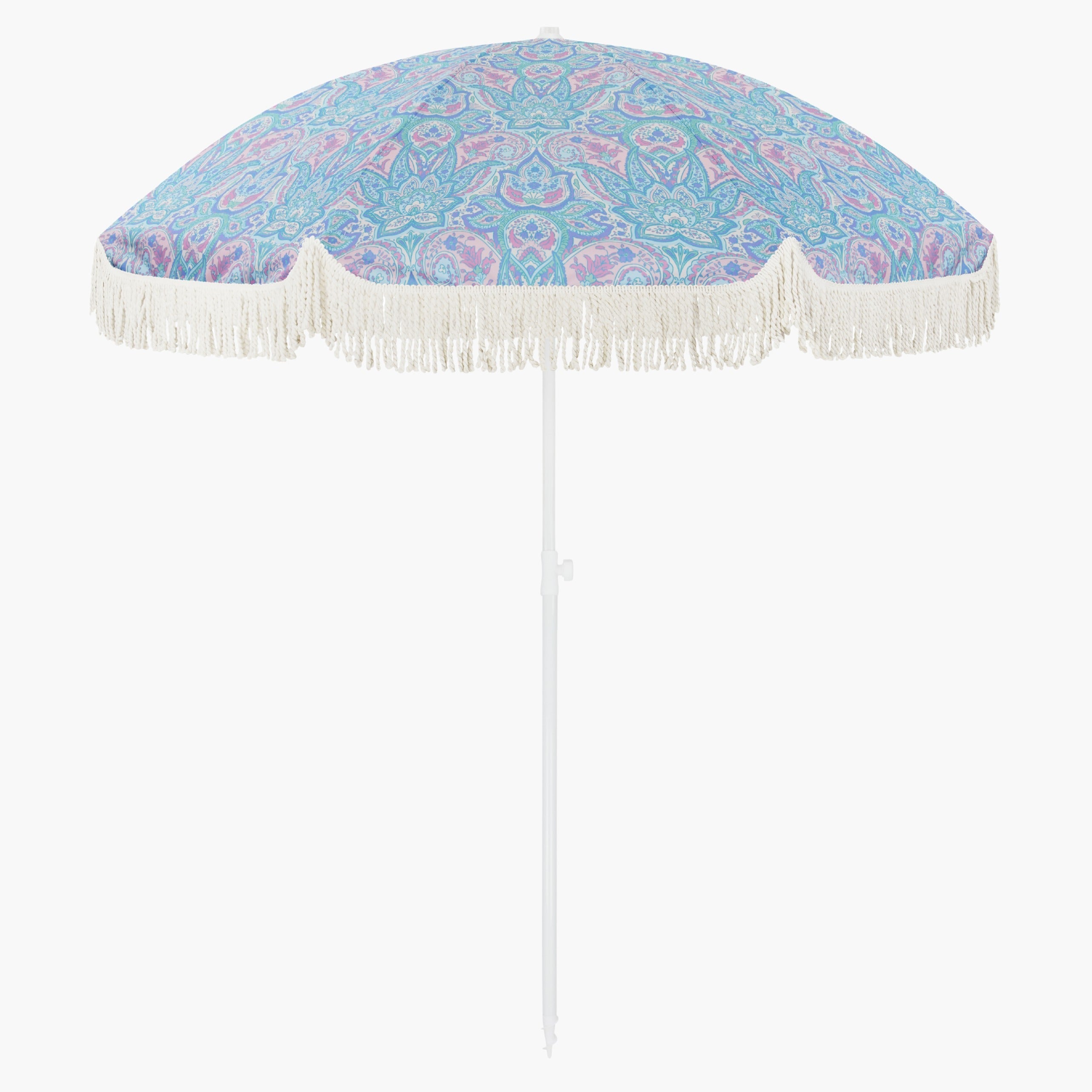 The Tide beach umbrella features a bohemian print in refreshing hues of blue, aqua, cream and soft pink. With UPF50+ premium canopy fabric, a tilting mechanism and a matching carry bag, it delivers adjustable shade and effortless portability. Tide pairs beauty with function for coastal days and summer escapes.