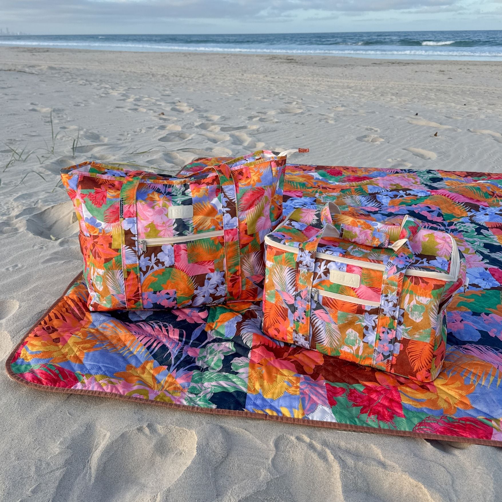Spot clean your beach bag with cold, soapy water. Always leave to dry before storing your accessories to prevent mould developing. Salt water and dirt should be cleaned immediately after use. Fabric will fade slightly over time if left in the sun.
